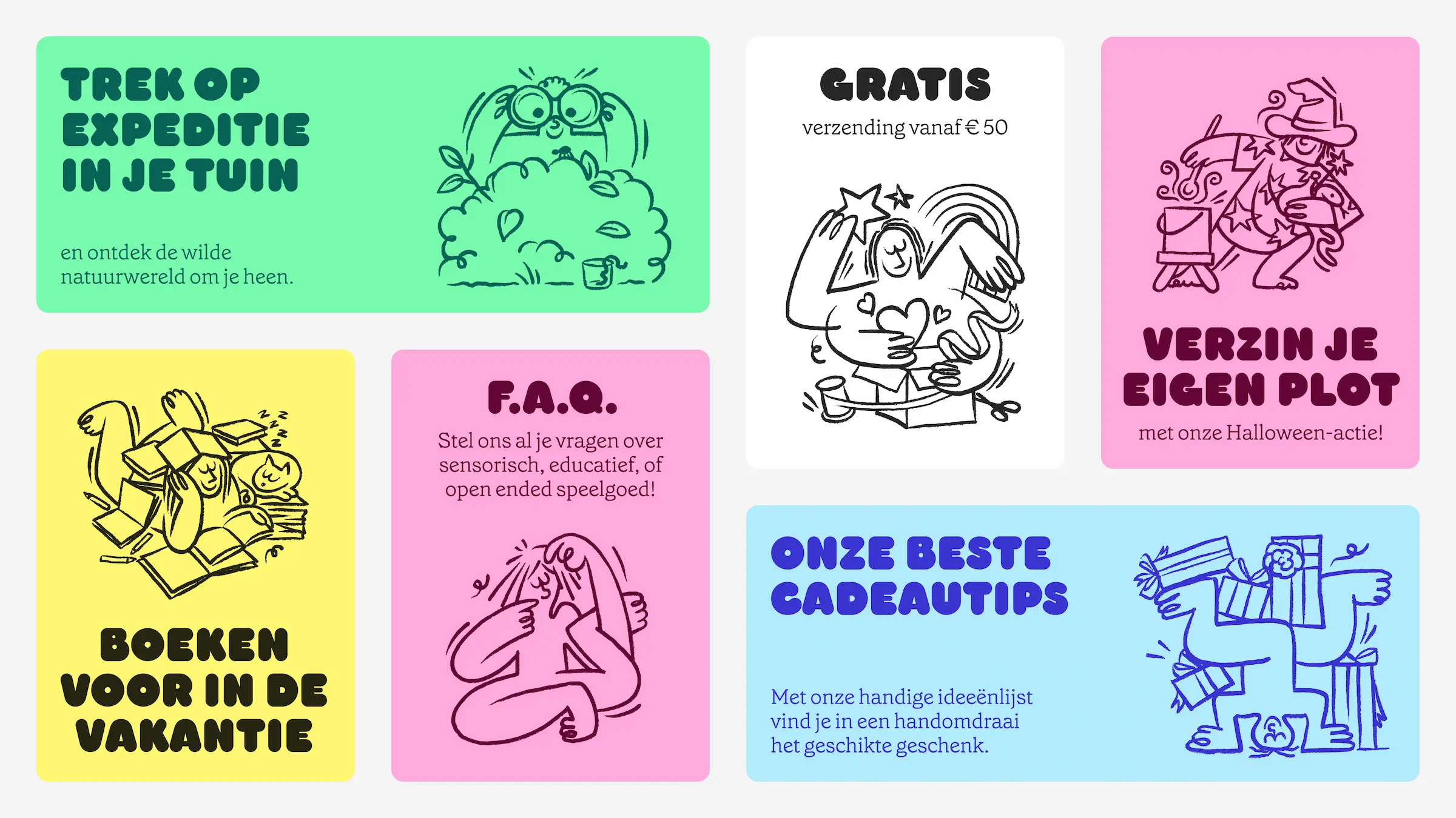 Illustraties zijn ook een belangrijke pijler binnen de brand universe van The Mini Story. Nog niet iedereen is vertrouwd met de termen “open ended” en “sensorisch” speelgoed, en de tekeningen helpen om deze concepten laagdrempelig te visualiseren. Daarnaast helpen ze mee het unieke merk van The Mini Story te definiëren, en zijn ze een dankbaar element om instant een flinke dosis pret en enthousiasme te injecteren.